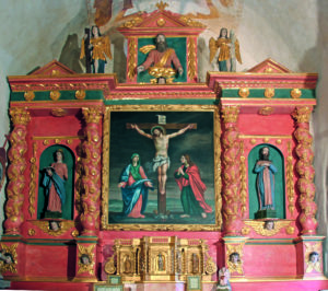 Le maître-autel de Vèze a été restauré en 2007 et possède de très beaux et vifs coloris (fig. 11). C’est un retable à trois pans et quatre colonnes torses posées sur de hauts pilastres où sont sculptées des têtes d’anges aux expressions sévères. La cornicue denticulée à décrochement reçoit un couronnement où prennent place une figure de Dieu le père et deux anges porteurs, l’un de la croix (manque la traverse) et l’autre de la colonne de flagellation (comme à Moissac). Les niches reçoivent les statues (de facture très fruste), de sainte Catherine et de saint Guillaume, attribuables à Mosnier tout comme le reste de la boiserie. Au centre, un tableau plus récent, une crucifixion de Jean Peuch aîné de Salers, actif vers 1830, a remplacé une toile disparue (ou repeinte ?)[16]. Le tabernacle est très travaillé avec ses cinq niches, ses colonnes torses et ses ailerons.