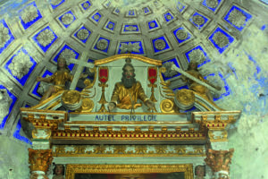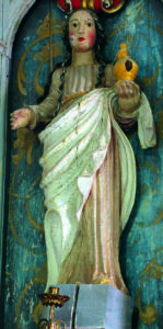 Le retable du maître-autel de la chapelle de Turlande occupe tout le fond de son chevet plat (fig. 9). C’est un retable à trois pans, pourvu de trois niches : la niche centrale recevait la vierge romane vénérée à Turlande, et les deux latérales reçoivent des statues de sainte Madeleine (figure 10, vénérée en raison de reliques données au XVe siècle) et d’un évêque (saint Robert de Turlande ? Fondateur de l’abbaye de la Chaise-Dieu, il était originaire du lieu et parfois représenté en évêque). Les colonnes torses centrales évidées au centre sont une véritable prouesse technique. Les têtes d’angelots figurées sous les niches sont de même facture qu’à Bredons (retable de la famille de Béral) et Vèze. La corniche reçoit un grand médaillon (portant une inscription illisible) ainsi que deux grands anges porteurs d’une guirlande de nuages. Leur facture est proche de celle du retable de Moissac.